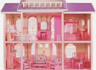 The bedroom is a totally different scene. Soft grey walls with burgundy and mauve, pink, and white flowered wallpaper trim. The bedroom furniture is all black or dark cherry wood, but her bedspread is again pink and mauve and flowered. Why all the flowers? Gross.